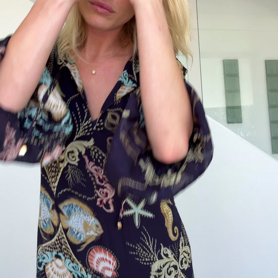 • Deep navy coloured base with light blue, gold and pink sea motifs design