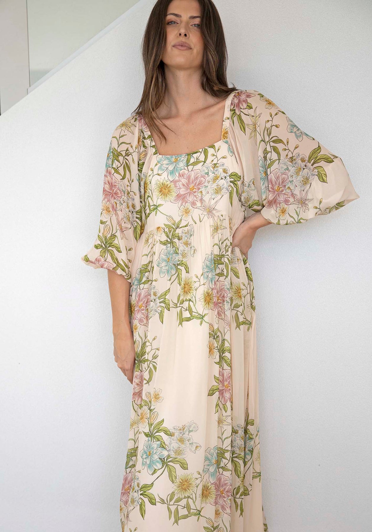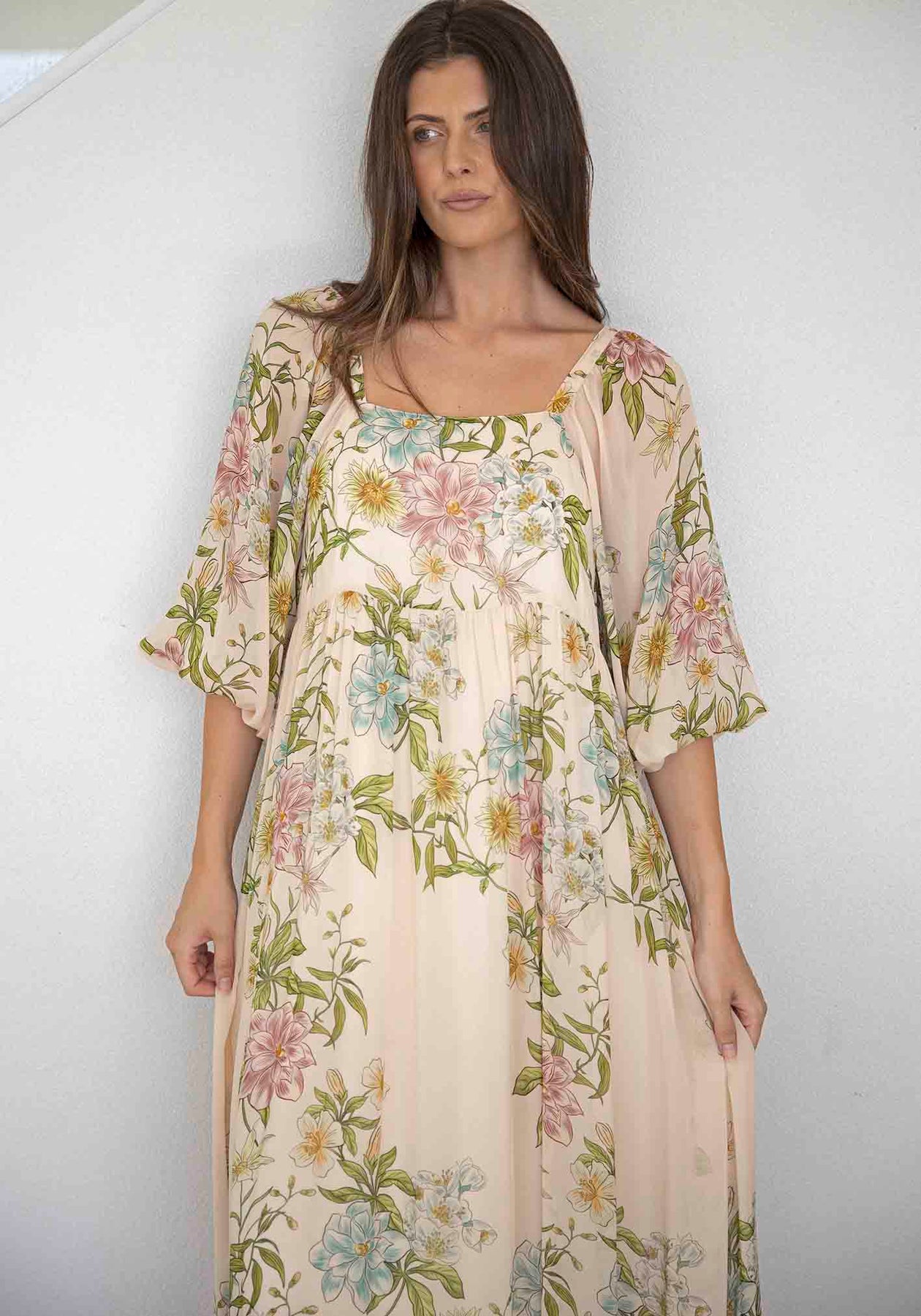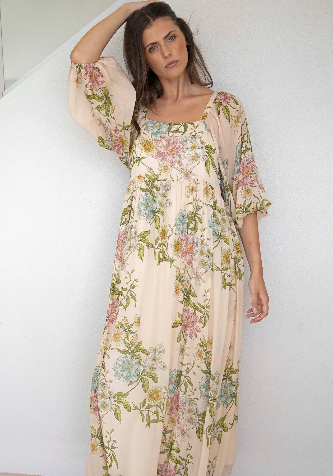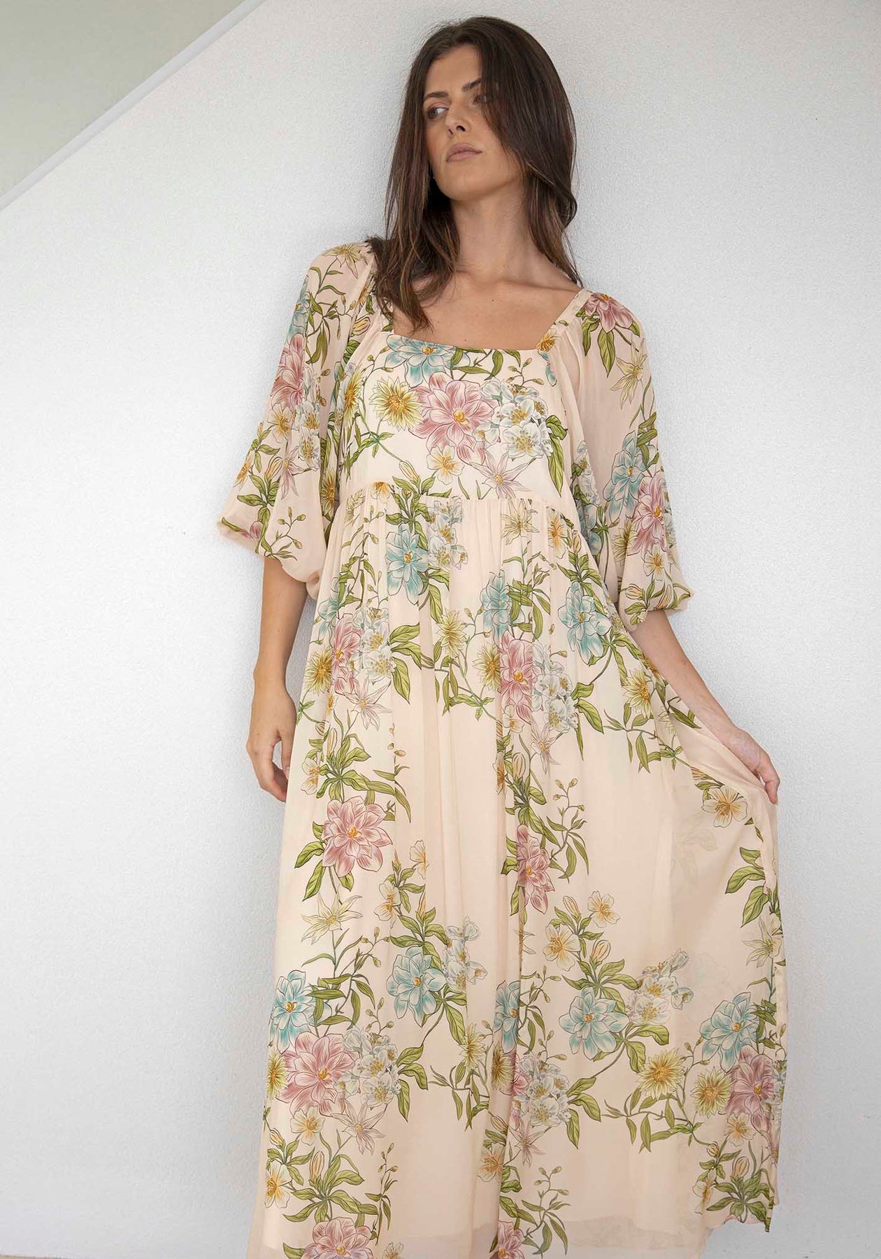 Momento Cream Floral Square Neck Maxi Dress