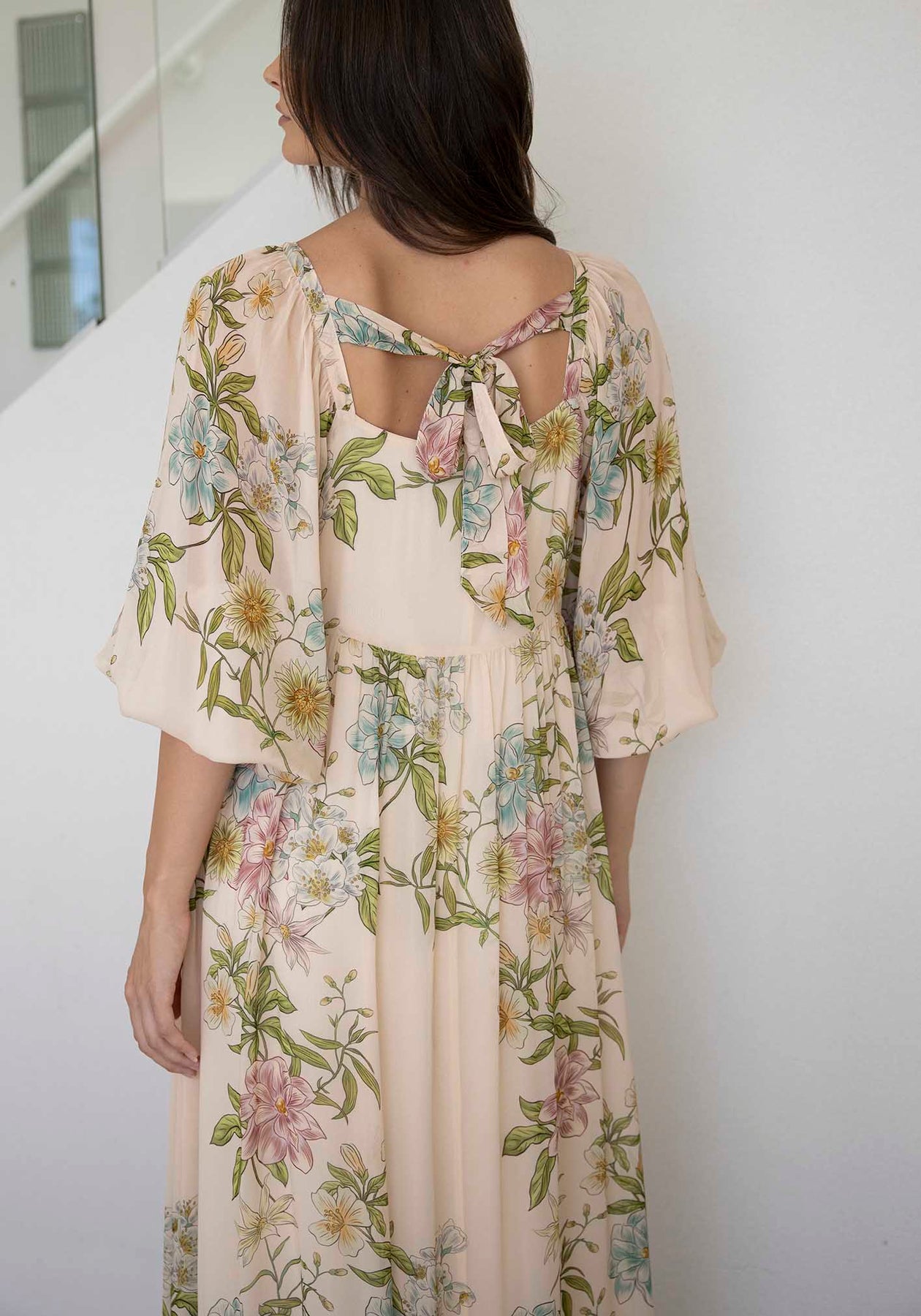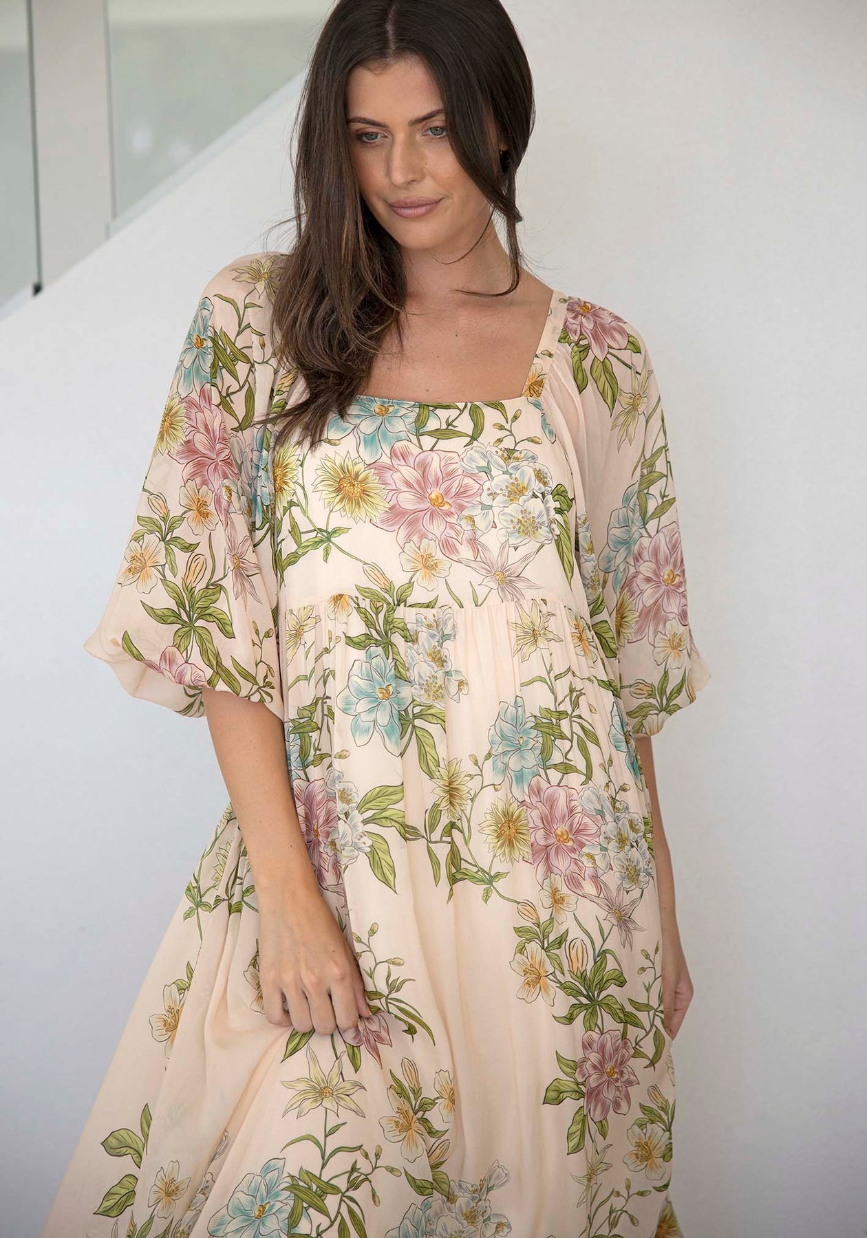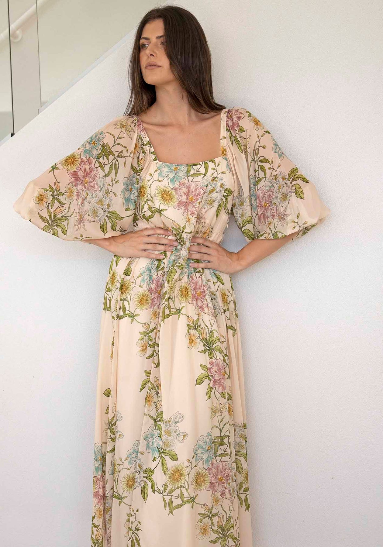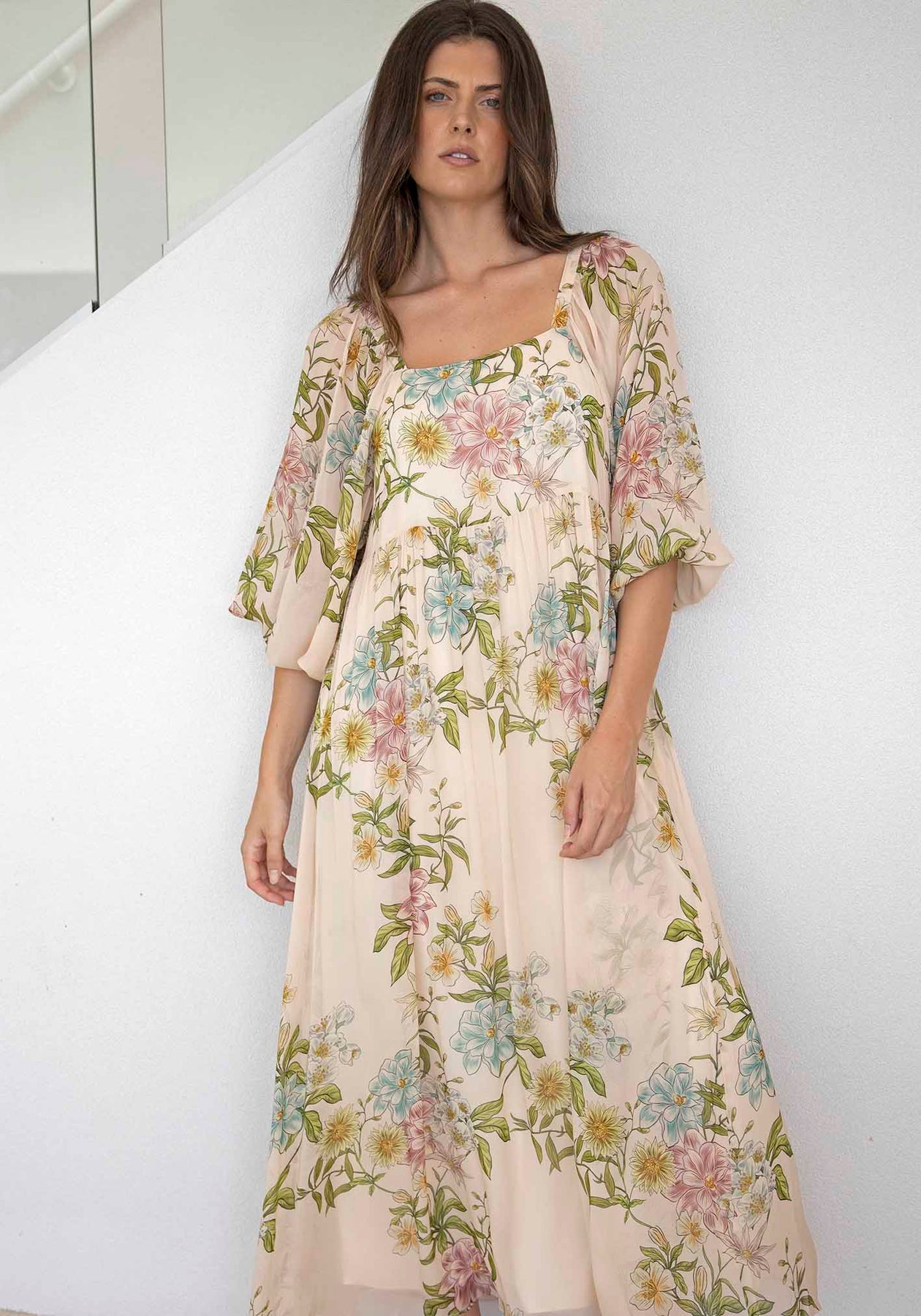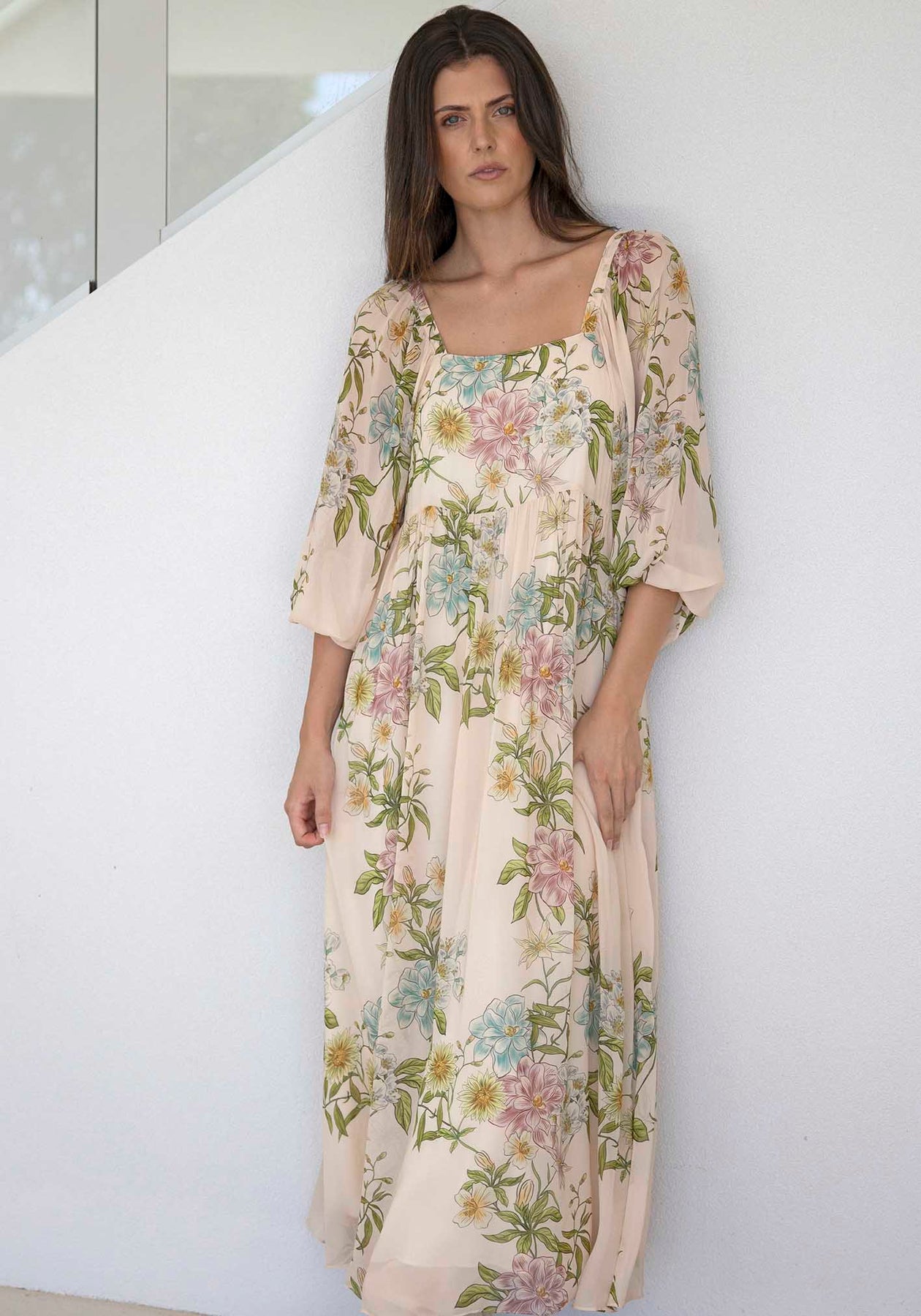 Momento Cream Floral Square Neck Maxi Dress