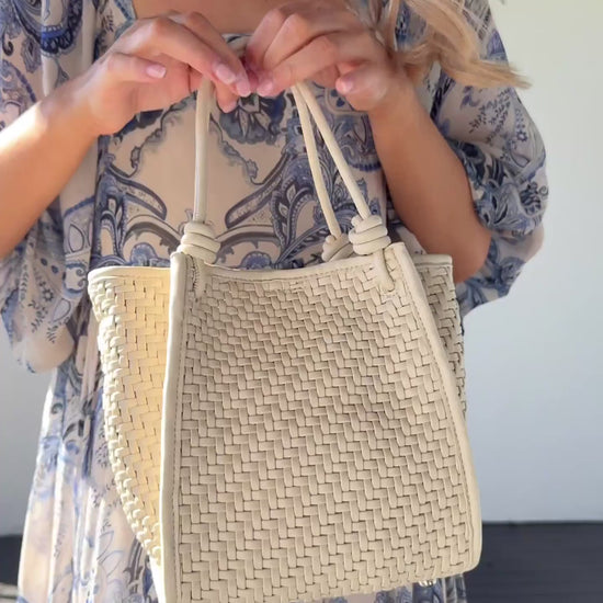 Crafted from super soft premium cowhide leather, the Milan White Woven Leather Bag features a distinctive double-sided woven design. It offers versatile carrying options with a sturdy handle and a detachable shoulder strap. The bag secures with a press button closure and includes a removable canvas inner bag with a zipper for added organization. Finished with sleek silver hardware, this bag combines expert craftsmanship with practical functionality for everyday use.